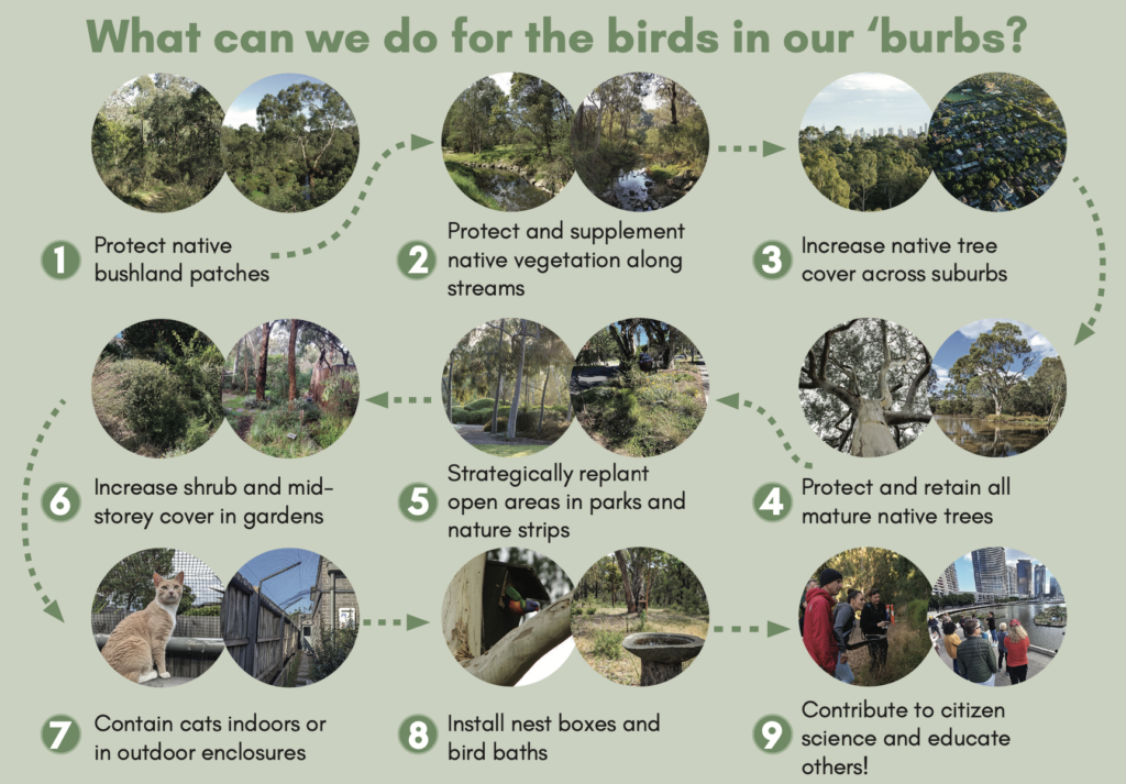 Different species have different habitat requirements and it’s unlikely that whatever you do will entice a white bellied sea eagle to visit your backyard birdbath in Sunshine or Paddington. But you can make some small changes to increase the number and variety of birds (and other animals) that visit your garden and places of work and recreation.