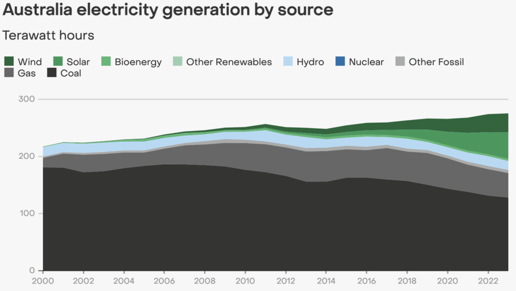 Obviously, the amount of electricity generated varies enormously, with Australia being two orders and one order of magnitude lower than the world and China respectively. China generates about a third of the global amount. Notwithstanding the very different amounts generated from different sources and the different trajectories of total electricity generation over the decades, in 2023 fossil fuels supplied a similar proportion of electricity in all three (around 65%).