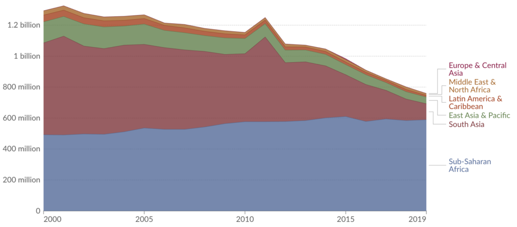 Between 2000 and 2019 the number of people worldwide with access to electricity capable of providing basic lighting and charging a phone or powering a radio for four hours a day increased from 4.8 billion to 6.9 billion. The number without access almost halved from 1.3 billion to 761 million. The gains were not attained equally across the world, however.