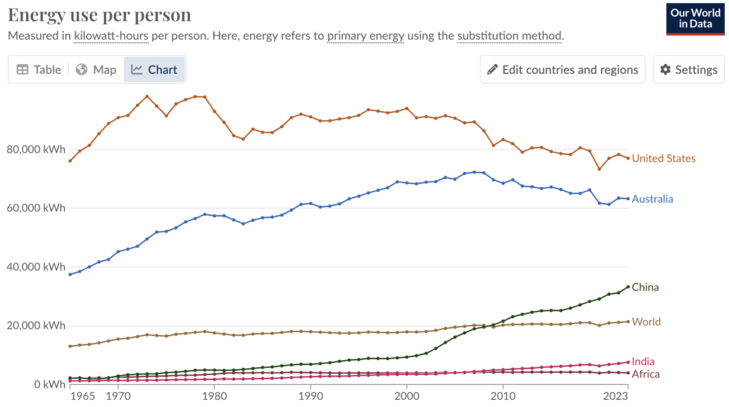 Not surprisingly, this is all reflected in the energy use per person in different countries and regions.