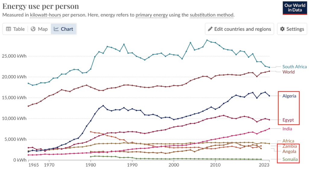 Note in particular the positions of the World and Africa in the graph above. Now see below the enormous differences within Africa. South Africa’s usage has been falling for almost 20 years and is now almost the same as the global average. North African countries are below the world average, but steadily increasing, roughly in parallel with but higher than India. But usage per person in Sub-Saharan African countries is well below the world average and not going anywhere.