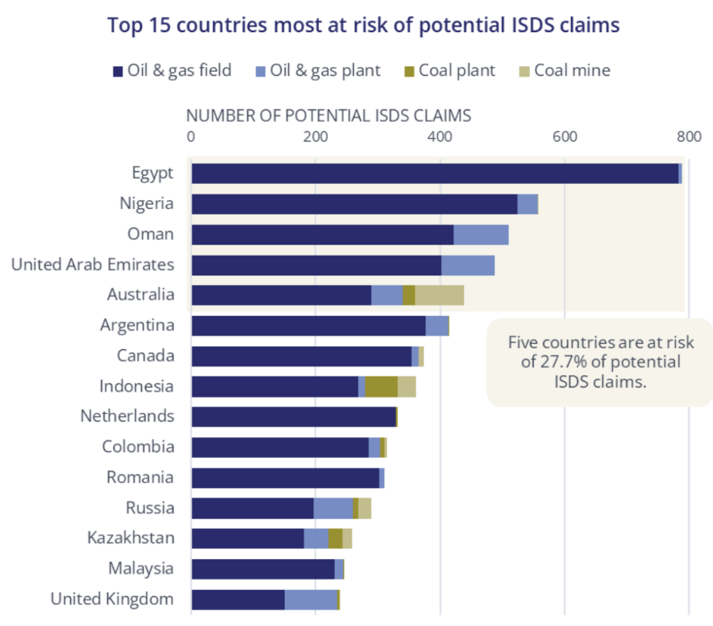 It is particularly concerning that some litigation opposing climate action occurs not within properly constituted, publicly accountable courts of law but in secretive tribunals established by international trade agreements to consider claims for compensation by companies that feel that their financial interests have been damaged by a country’s policies or legislation – a process known as Investor-State Dispute Settlement. Australia ranks fifth in the world for its exposure to potential ISDS claims by fossil fuel companies seeking billions of dollars in compensation for government climate change policies.