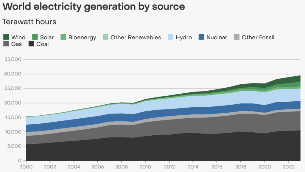 If you follow the link above, you can explore similar data for the countries of your choice. If anyone cared to look at it, I suspect that there would be a fairly direct correlation between the amount of electricity generated in 2023 and the number of Olympic medals won at the recent games, although confounding rather than causation is the likely explanation.