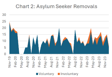Removal of unsuccessful asylum seekers (both voluntary and involuntary) remains modest at less than 20 per month (see Chart 2). The government mainly relies on these people departing without the immigration compliance area playing any role. The number of such departures remains low.