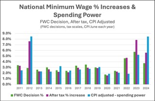 2023 and 2024 stand out because they followed recommendations from the Labor government to the AWR that minimum rates should keep up with inflation, and for 2024-5, Labor’s changes to the LNPs tax scales.