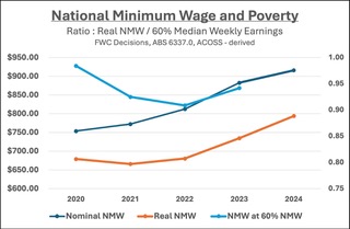 Last year’s decision at 3.75% set the NMW at $915.90 per 38-hour week, starting from July 1, 2024. It stays below the poverty line, despite recent improvements. It applied to minimum rates in all awards, including for other types of workers, e.g. with a disability and “junior” workers.