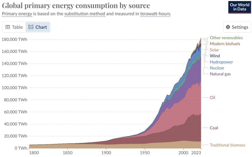 Several new fuels have come along since 1800 but in no case has a new fuel replaced an existing fuel. In every case, consumption of the old fuel(s) has continued to increase when a new fuel has emerged. Even the use of traditional biomass is greater now than in 1800.