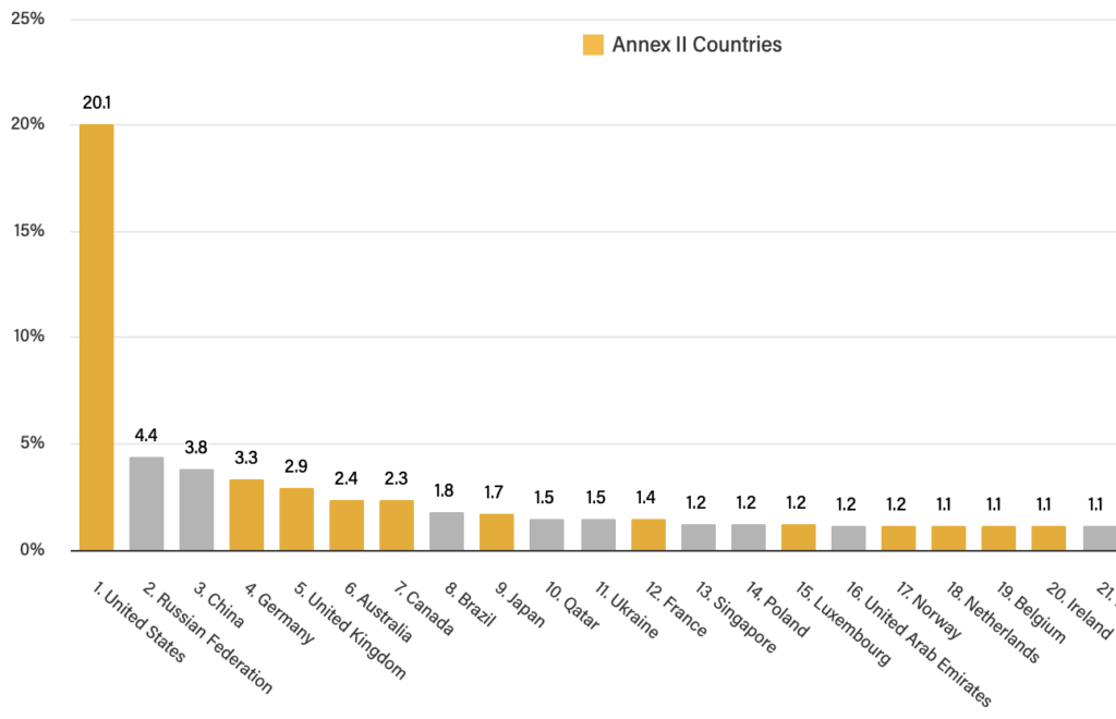 For one exemplar scenario developed in the calculator, the bar chart below shows the 20 countries with the most climate finance responsibility and their respective contribution share. The US’ share is 20% and Australia’s 2.35%. Approximately two-thirds of all the nations have a share of less than 0.5%, and a third have a share of less than 0.1%.