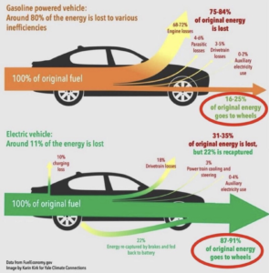 because solar is so much more efficient than fossil fuels, the world will need less than half as much energy in a solar-dominated world as we do now. For example, EVs turn 90% of the energy in batteries into useful energy, whereas petrol-driven cars convert only 20-30%.