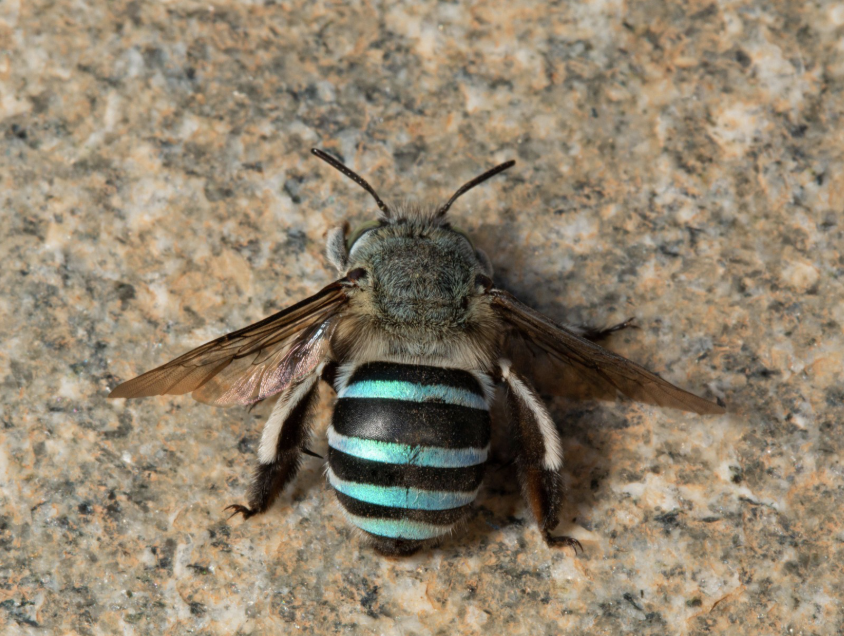 Blue-banded bees like to live alone but have their rellies nearby. They dislodge pollen by holding the flower and shaking their bodies rapidly – a process known as buzz pollination or sonification.