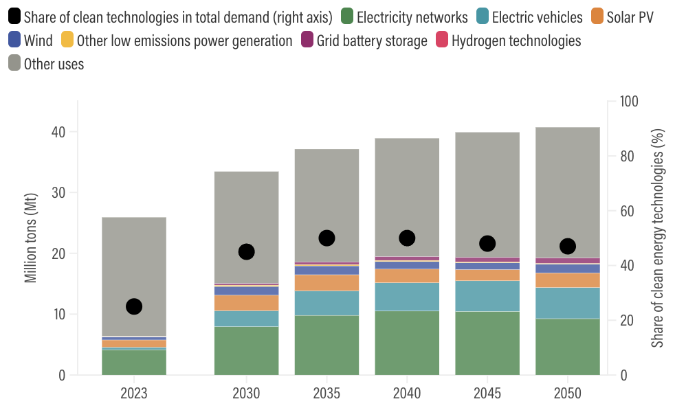 The demand for copper is expected to increase by 50% between 2023 and 2050, by which time clean energy technologies will make up 50% of total demand.