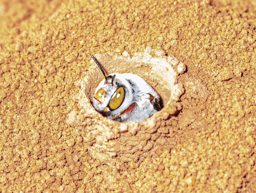 Dawson’s burrowing bee is big: 23mm long with a wingspan of 45mm. The female was the role model for frackers. She digs 15mm-35mm down into clay or packed soil and then goes horizontally to create a nest (brood cell) for her egg.