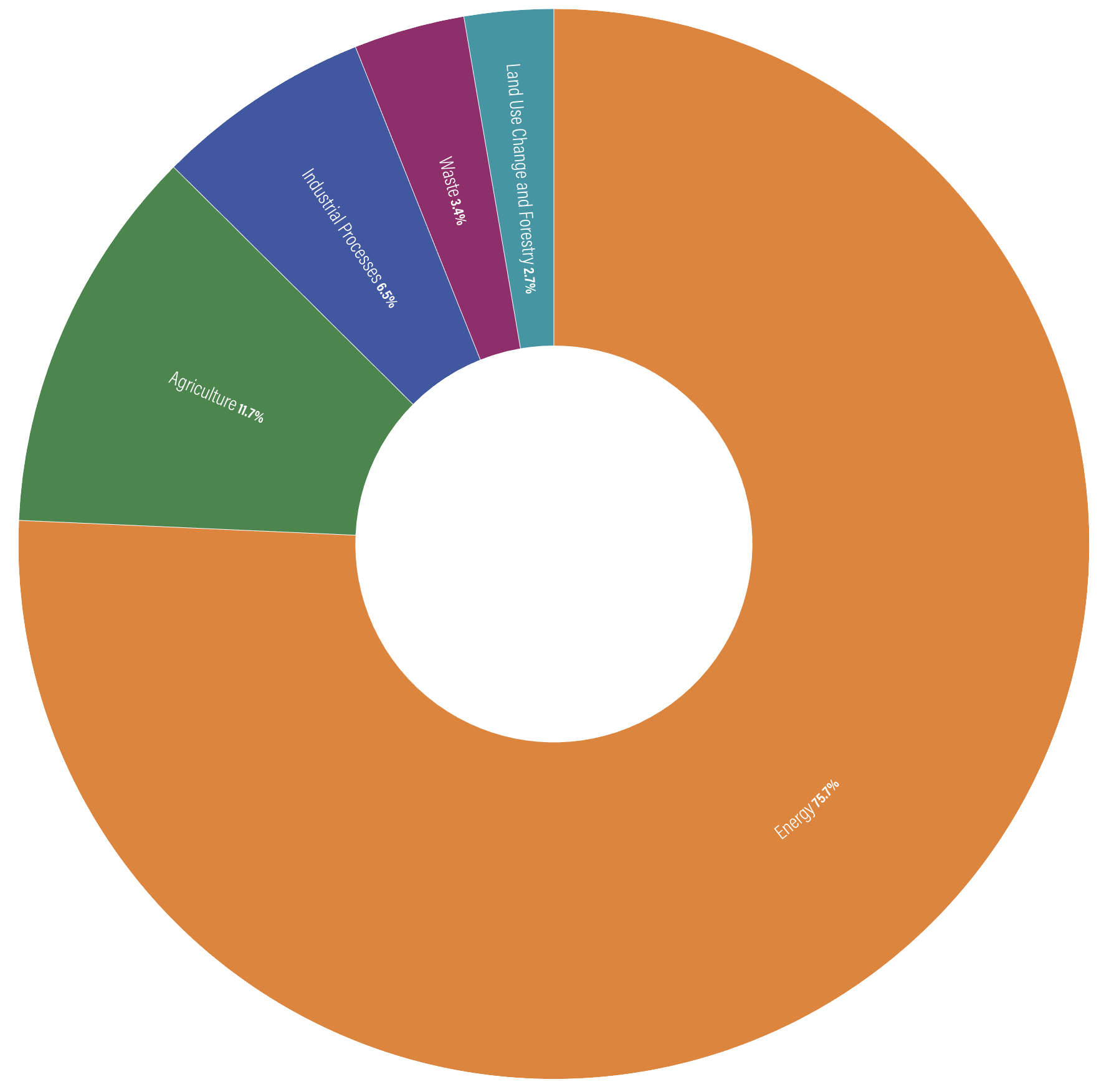 Agriculture (11.7%) and industry (6.5%), which many people could name as significant sources of GHGs, together produce less than a fifth of the total and less than a quarter of the energy sector’s contribution.