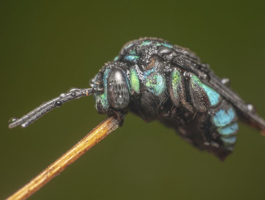 Neon cuckoo bees, you guessed it, lay their eggs in the brood cell of a Blue-banded bee, who have very thoughtfully already provisioned their nest with pollen and nectar for their own expected young who will starve to death when they hatch.