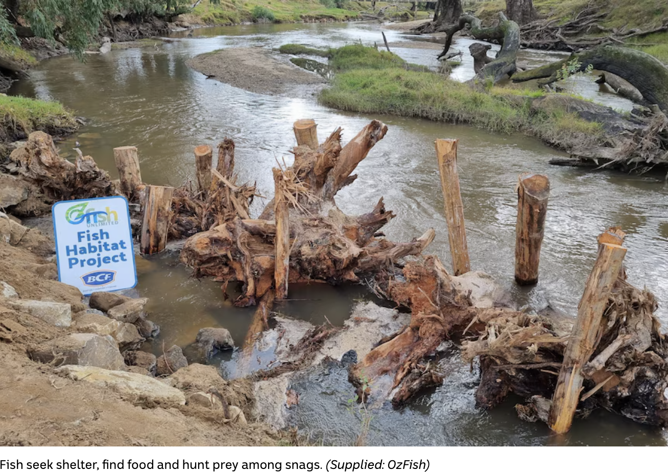 Why have Murray Cod all but disappeared from the Murray River? Because Murray Cod mostly live near woody “snags” in the river that are created by fallen dead trees but when the river became a navigation route in the 19th century the river red gums that lined the banks, were cleared to “de-snag” the river.