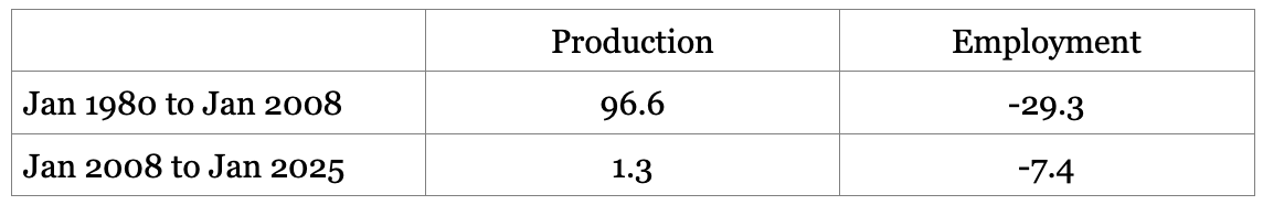 But if American manufacturing production continues to grow while employment fell, that effectively means productivity increased. This increase was driven by technological change, and automation in particular, so foreigners could not have taken American jobs as US production is rising, not falling.