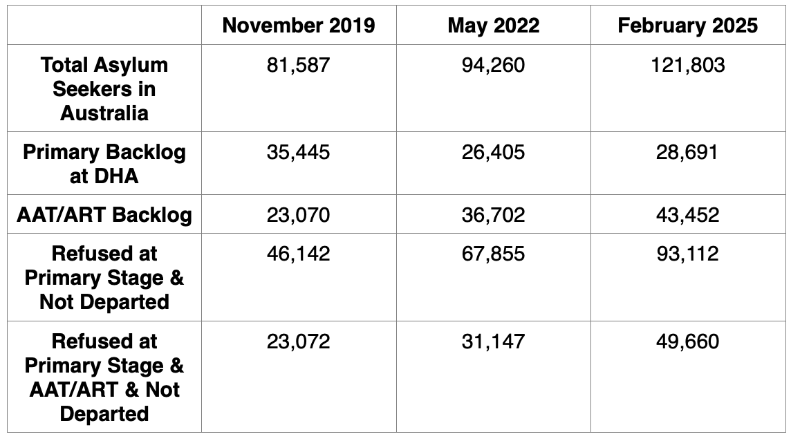 Table 1 shows that Labor has managed to stabilise the asylum-seeker backlog at the primary stage. But the number refused at the primary stage and not departed, as well as those refused at both primary stage and AAT/ART and not departed, has continued to grow.