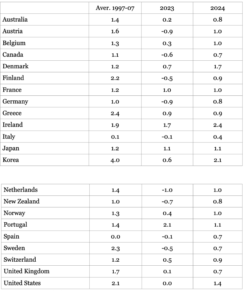 The problem is that productivity growth in the last couple of years has been significantly lower in almost all the advanced OECD economies than the average rate of productivity growth a couple of decades previously between 1997 and 2007 (see Table 1). The only exceptions are Japan and Spain, which had poor productivity growth around the turn of the century, and Denmark and Ireland.