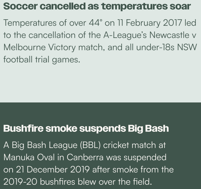 Heatwaves, droughts, floods and bushfires are all consequences of climate change and all are potential causes of illness and injury during professional and community sporting activities. The Environmental Defenders Office has released a four-step guide for club members and local sports clubs to help them avoid the harmful effects (and associated legal risks) of extreme weather events during sporting activities: