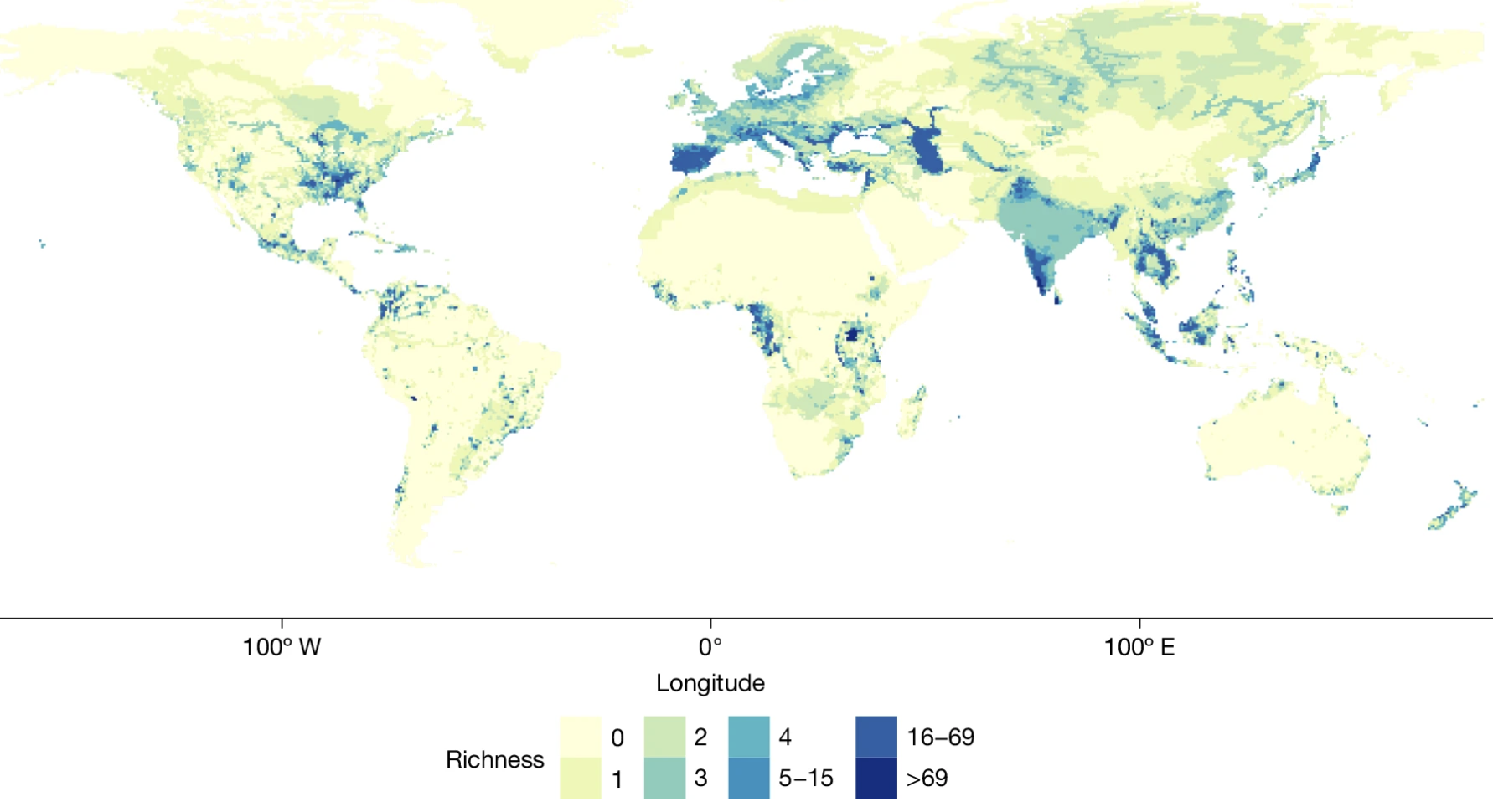 At the other end of the taxonomic tally, more than 200 new species of freshwater fish have been discovered worldwide each year for the last four years – more than 900 in total. South America and Asia have together contributed 85% of the new species. Most new discoveries live in lakes, pools, rivers and streams but Ophisternon berlini, a blind eel, lives in muddy soil in Costa Rica and members of the newly discovered Karstsinnectes genus live in pools in caves in China. Of course, just because they are newly described by “Western” science doesn’t mean that indigenous peoples didn’t know about them or that many of them are not also threatened with extinction.