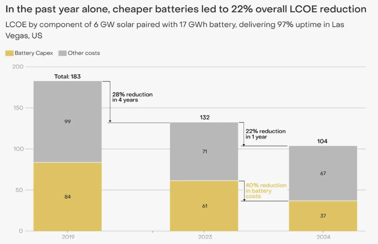 Ember says battery technology is advancing at “lightning speed”, with prices falling by 40% in 2024 alone, hitting a record low of US$165 per kWh for a full battery system (excluding Engineering, Procurement and Construction and grid connection costs).