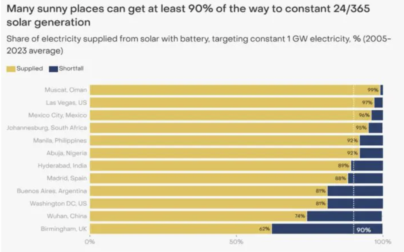 “Even Birmingham in the United Kingdom reached 62% of the way to 24/365 solar generation,” it says.