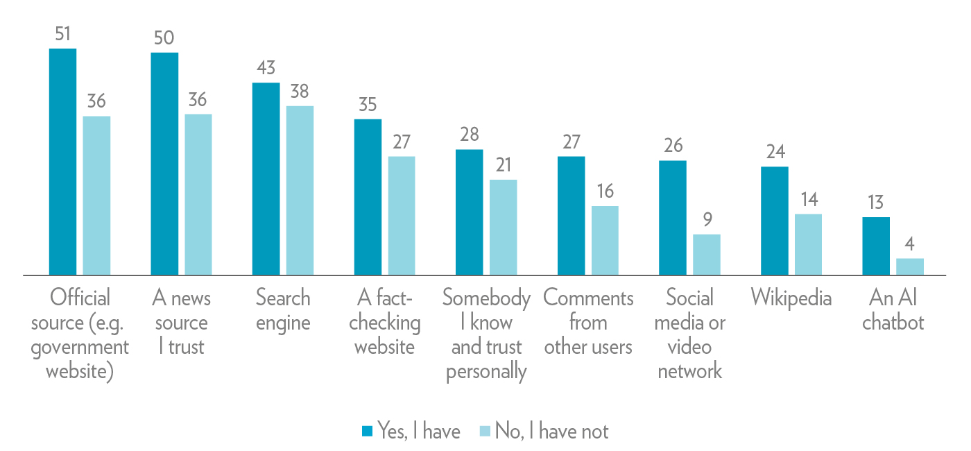 When it comes to checking online information that may be false, misleading, or fake, people who have received news literacy education are much more likely to say they go to news sources they trust (50%) compared to those who have not (36%). They are also more likely to turn to official websites and fact-checking. These active verification behaviours confirm the importance of news literacy education in helping Australian consumers navigate the complex online environment.