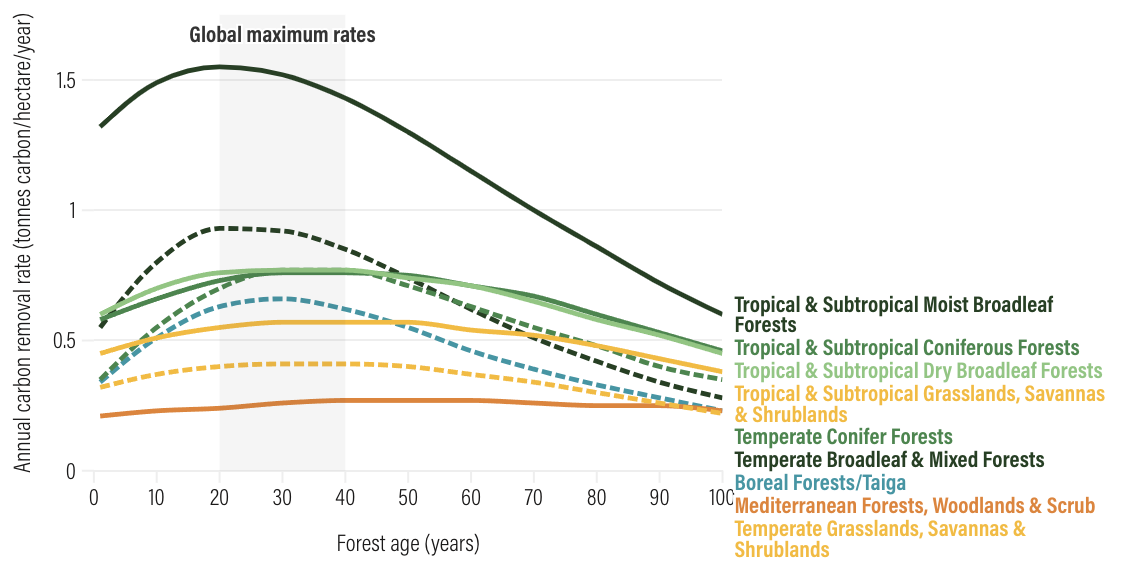 The annual rate at which a naturally regenerating forest removes carbon from the atmosphere varies with its location and the age and type of trees. The figure below shows that in naturally regenerating forests (1) at all ages, Tropical and Subtropical Moist Broadleaf Forests absorb more CO2 than all the others, (2) there’s a fairly small difference in carbon storage rates among the rest, and (3) with the exception of Mediterranean Forests, Woodlands and Scrub, annual carbon storage rates increase rapidly in the first two decades of a forest’s life, peak in the third and fourth decades and then tail off.
