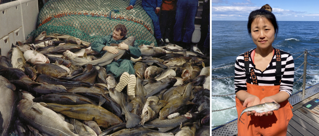 The decreasing size of cod is more dramatically illustrated in the two photos below from the Baltic Sea. The photo on the left was taken in 1987 during a research expedition. The photo on the right shows that today a fully grown cod can be held in two hands and served on a dinner plate.