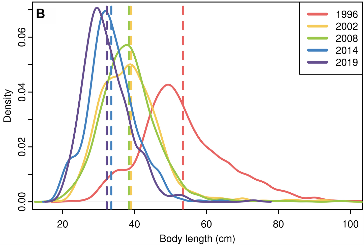 Not only have cod numbers declined as a result of overfishing combined with environmental changes, so has their size. The modal length of cod caught in 1996 was about 50cm; in 2019 it was about 30cm ( figure below).