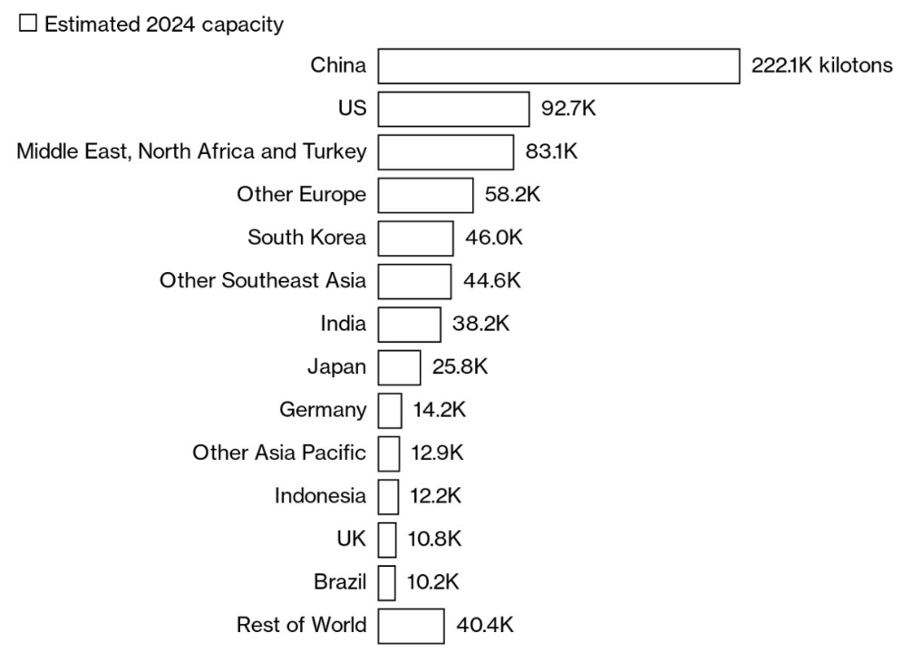 Nations are currently trying to bash out, at their sixth attempt, a global plastics treaty in Geneva. The major sticking point is that most nations want a comprehensive treaty that covers reduced production of plastics and more and better recycling, while the major plastic-producing companies and nations want the treaty to cover only recycling. The bar chart below from Bloomberg Green Daily on 5 August 2025 shows the current production capacity of the top plastic producing countries (a kiloton is 1,000 tons). Seven countries produce 85% of the world’s plastic.