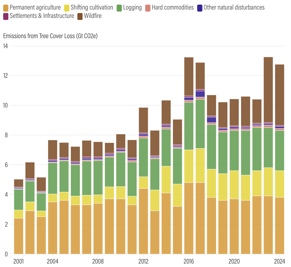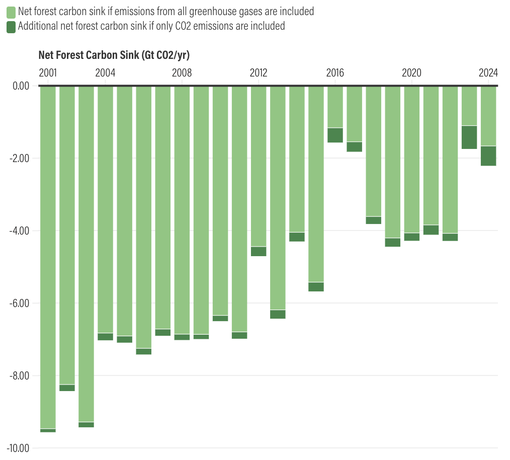 Over recent decades, however, the ability of the world’s forests to absorb CO2 has declined and CO2 emissions from them have increased. The inevitable outcome has been a reduction of the net carbon sink created by forests. The histogram below shows that 20 years ago forests had a net effect of removing around 8 Gt CO2/year, but that it has been steadily decreasing since then and in 2023 and 2024 it was about only 2 Gt CO2/year. The result has been an increase in the concentration of CO2 in the atmosphere, increased and accelerated global warming, more extreme weather events, some of which are also more extreme, and increased harm to humans and damage to food and water security, infrastructure and the environment itself.