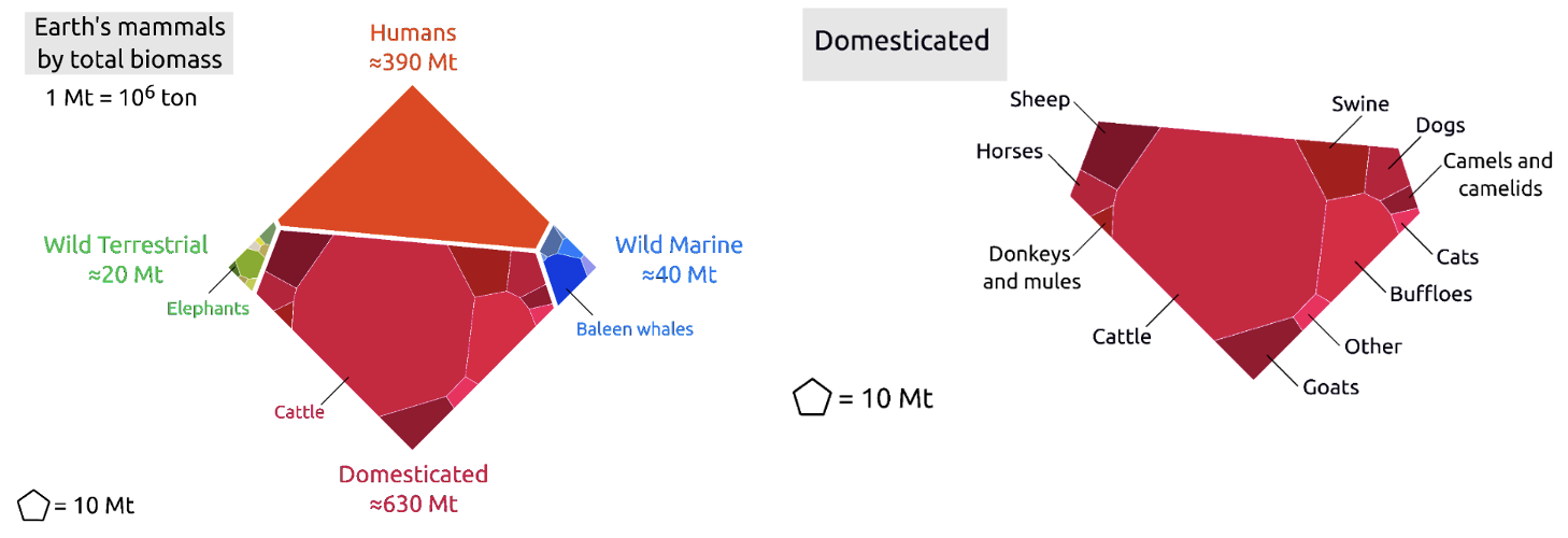 The most staggering feature of the numbers above is the enormous weight of humans and their animals, roughly a thousand million tons (Mt), compared with all the world’s wild mammals, roughly 60 Mt. Cattle alone weigh 416 Mt. Our pet dogs collectively weigh almost as much as all the wild land mammals.
