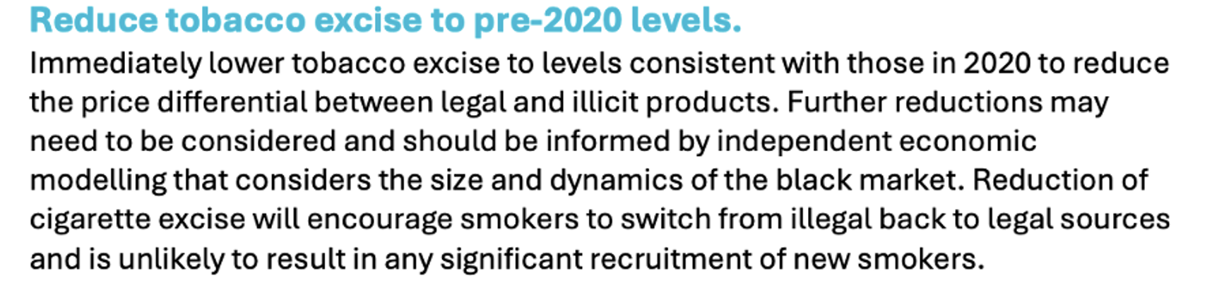 Or according to Kingsley Wheaton, chief corporate officer for British American Tobacco, who flew out to Australia in June to talk about the “basic economics” of tobacco tax, this should involve a “ reversion to the 2018 (tobacco tax) rate”.