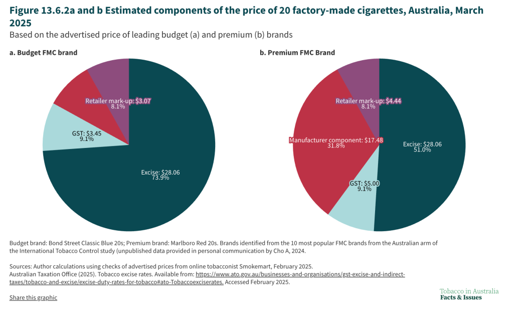 In 2019, excise tax on cigarettes per stick was $0.81775 (in March) and $0.96653 (in September) – see Table 13.6.2 here. This means that the tax component in 2019 of a pack of 20 was either $16.335 or $19.3306. For retail price, we need to add GST and the manufacturers’ and retailers’ margins (see chart below for the current proportions) to see what a legal pack of 20 cigarettes would retail at under the new retro tax regime proposed by our disappearing black market pundits.