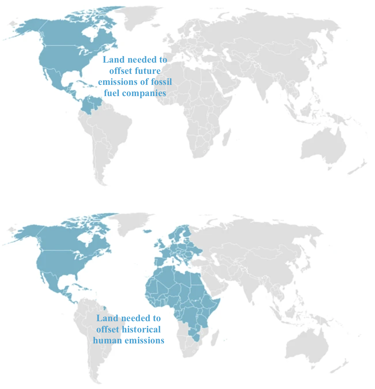 The two maps below show (top) the area of land that would be needed for afforestation to offset by 2050 the future emissions from fossil fuel reserves and (bottom) the area of land that would be needed to offset historical human emissions. To offset both groups of emissions, the maps’ blue areas must be added together, which would leave just Asia and Australia grey.