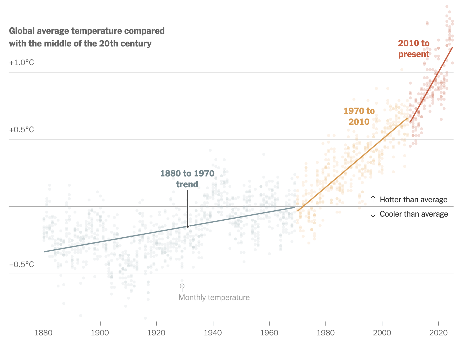 As an aside, I think you can make a case that it would have been even more instructive to split the first time period into two: 1880-1930 when the trend was flat and 1930-1970 when the temperature increase began. Indeed, when I look at other graphs and datasets, it seems pretty obvious that between 1850 and 1925 there was no real change in the average global temperature but since then the temperature has been increasing relentlessly.