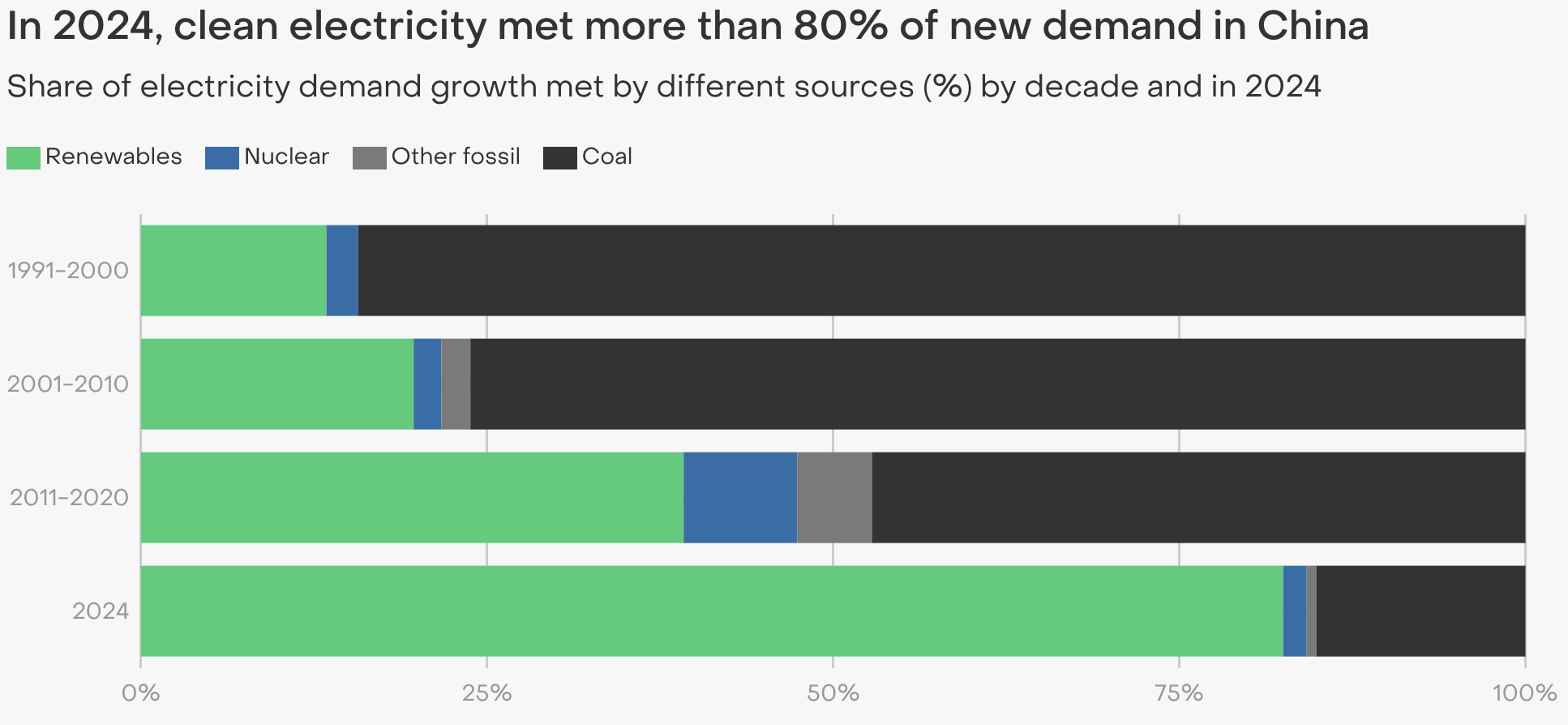 The third graph shows that, whereas in the last decade of the 20th century coal supplied 85% of the increasing demand for electricity, by 2024 this had shrunk to 15% and renewables were meeting 80% of the growth.