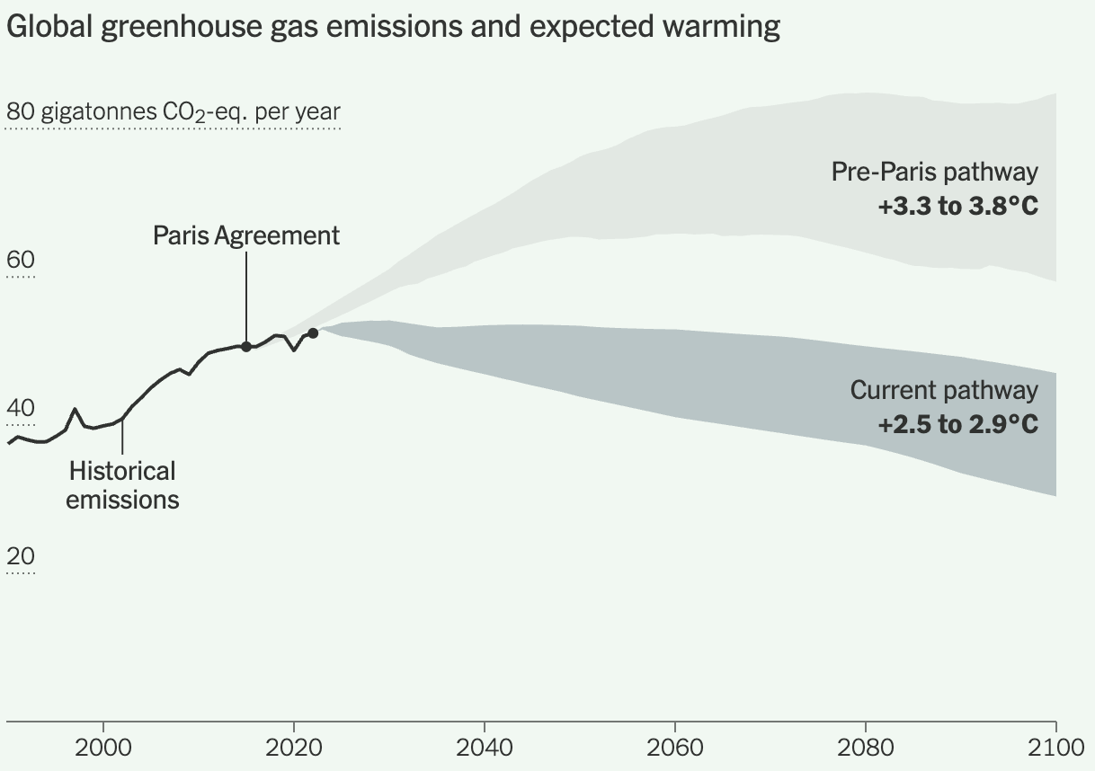 - Emissions are still rising but not as fast as they were and the predicted temperature increase (based on promises of action rather than current action) by 2100 has fallen from 3.3-3.8oC to 2.5-2.9o