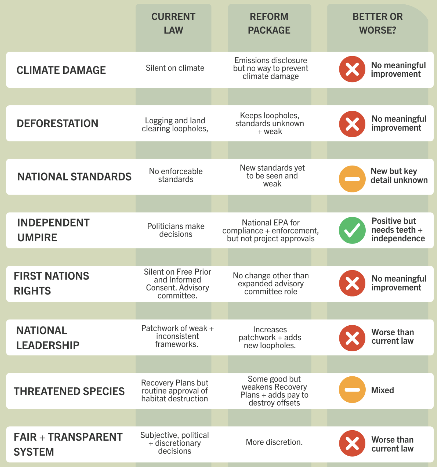 Should you want to know more, Greenpeace has summarised the good points in Watt’s reforms and the concerns that environmental organisations have with his proposals and Environmental Justice Australia has produced this scorecard: