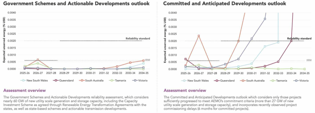 This is what AEMO actually says: “AEMO forecasts sufficient generation capacity to meet growing electricity demand within the relevant reliability standards in most regions and years in the next decade so long as these investments are delivered to schedule.”