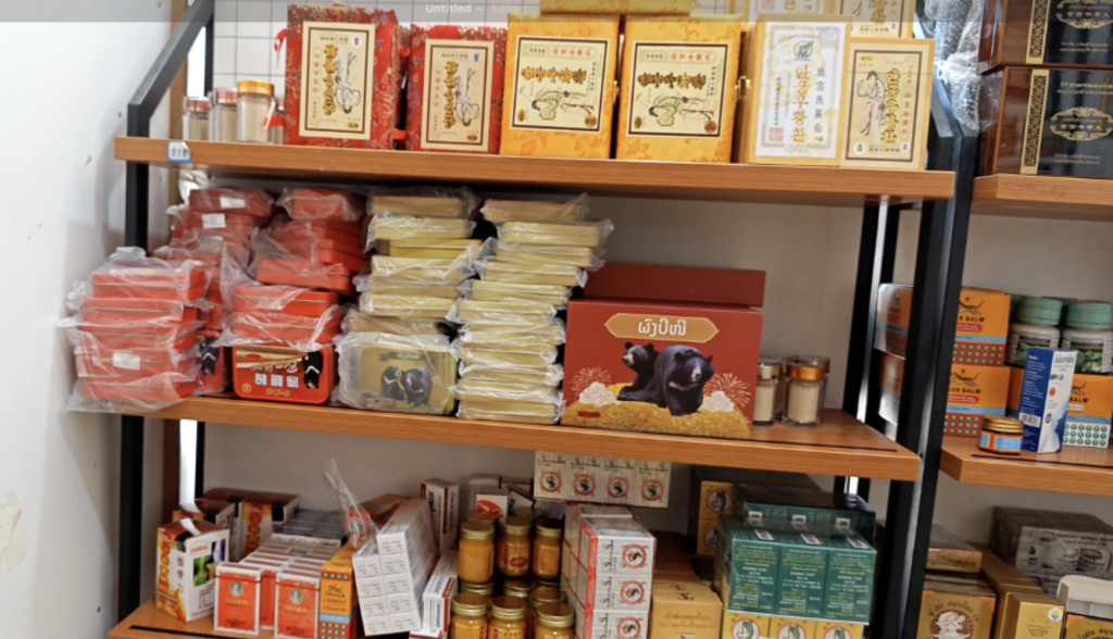 North Korean rhino horn products on top shelf and locally produced bear bile products on the second in a shop in Vientiane.