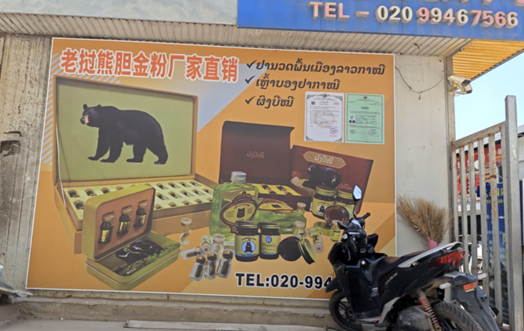 Advert for bear bile products on the side of a shop where they can be bought in Vientiane.