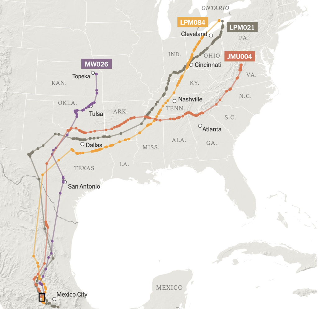 The tracks in the map above show the paths taken by electronically tagged individuals migrating south between mid-September and mid-November this year. Any guesses what the animal is? Its numbers have been in very serious decline in recent years.