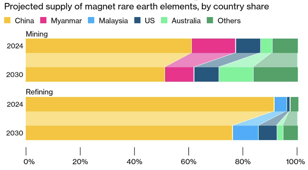 While some other countries are building their capacity, notably Myanmar and Australia regarding mining and Malaysia and the US with refining, China is projected to still control 50 per cent of mining and 75 per cent of refining in 2030, as demonstrated in the figure below from Bloomberg Green Daily on 31 October 2025.