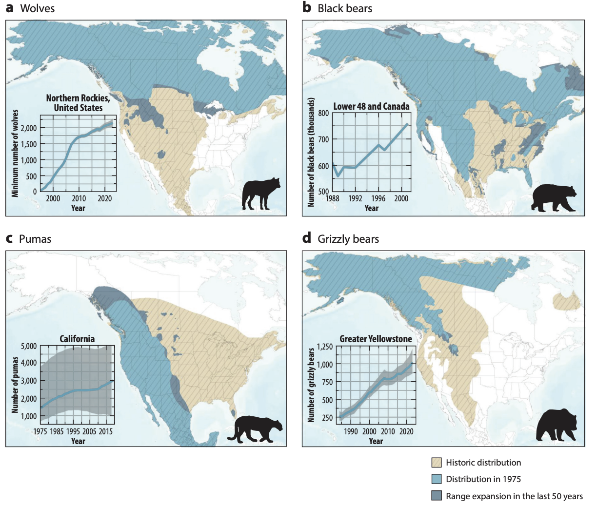 Examples of changing numbers and distribution patterns of predators in North America over recent decades.