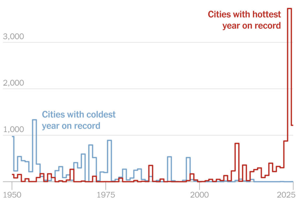 The histogram below shows that between 1950 and about 2000, the number of cities with populations over 50,000 that experienced record low temperatures were much more common than cities that experienced record highs. Since about 2010, however, the cities experiencing record highs have greatly outnumbered those with record lows. Last year, Manvi in India was the first city since 2014 to experience a record low.