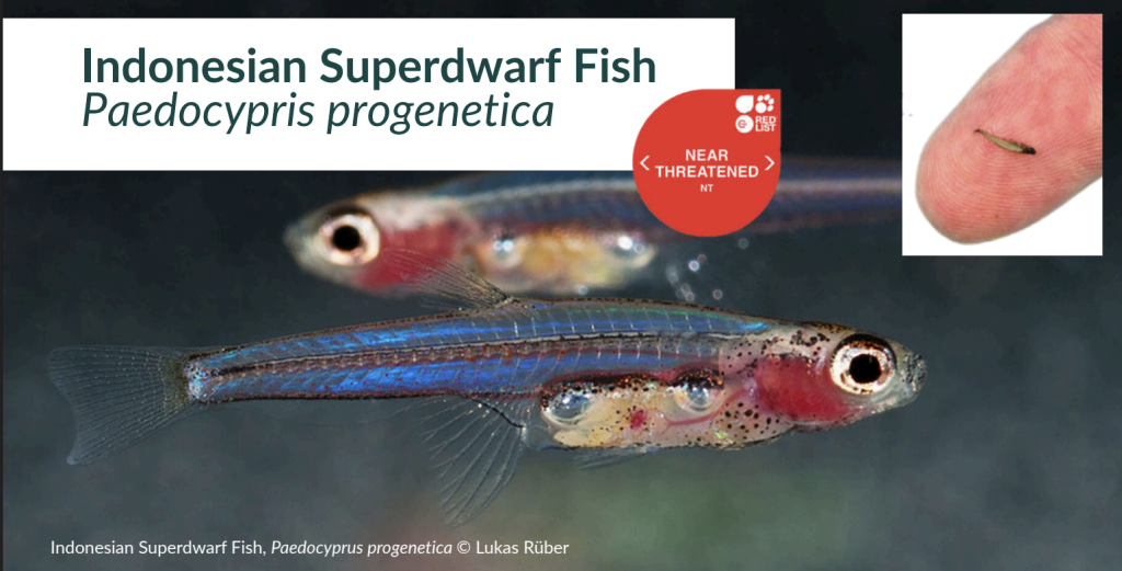 The smallest of the ten tiny fishes is the Indonesian Superdwarf Fish which grows to a maximum length of 10mm – that’s about the distance across the nail on your little finger – and is (arguably) Earth’s smallest vertebrate. It’s not easy getting everything you need to be a vertebrate into such a small body and so the adult Superdwarf retains some of the features that are characteristic of young fish, never develops some body parts that other adult fish possess, has a simplified skeleton with fewer bones and even has a pared back genome.