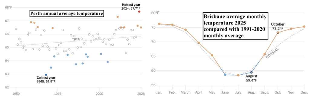 It’s interesting to examine last year’s average monthly temperature (oF unfortunately) and the average annual temperature since 1950 for Sydney, Melbourne, Perth and Brisbane – illustrated below to encourage you check out the link.