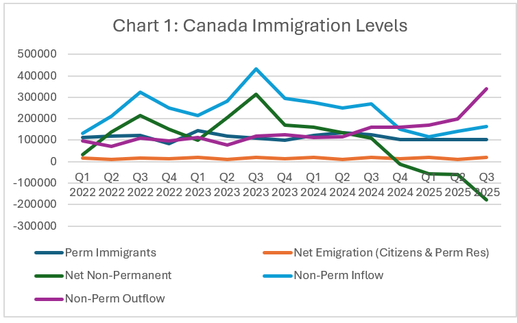 Driven by both policy change and a weak labour market, net emigration of non-permanent residents from Canada in the September quarter of 2025 was a record negative 176,479 with the outflow of non-permanent residents reaching 339,505 in the September quarter of 2025.